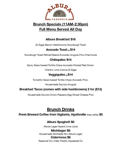 At Albura Taqueria, we believe that fresh is best, which is why we source locally as often as possible. Our menu features Maryland-grown vegetables and bison raised on spent grain from Sapwood Cellars’ brewing program. We can’t wait to help you explore our options and find your next favorite taco!